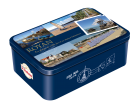 Une boîte en métal personnalisée aux couleurs d'Arcachon, conçue pour être réutilisable. Cette boîte métallique renferme une délicieuse sélection de biscuits bretons pur beurre : les galettes et palets La Trinitaine.