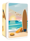 Un moment de détente sur un transat au bord de la mer, c’est l’invitation que vous propose cette jolie boîte métal aux couleurs douces.