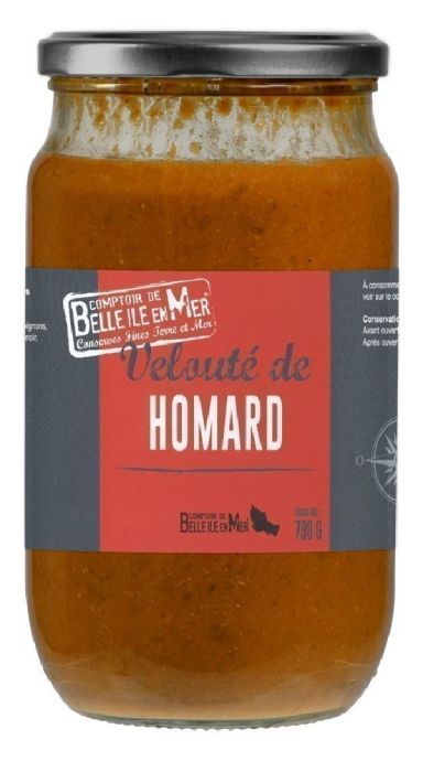 Eau, Homard 20%, poissons de roches, crème de lait, carotte, poireaux, amidon modifié maïs : xanthane, cognac, concentré de tomate, oignons, ail, sel marin, huile de tournesol, épices, bouquet garni.